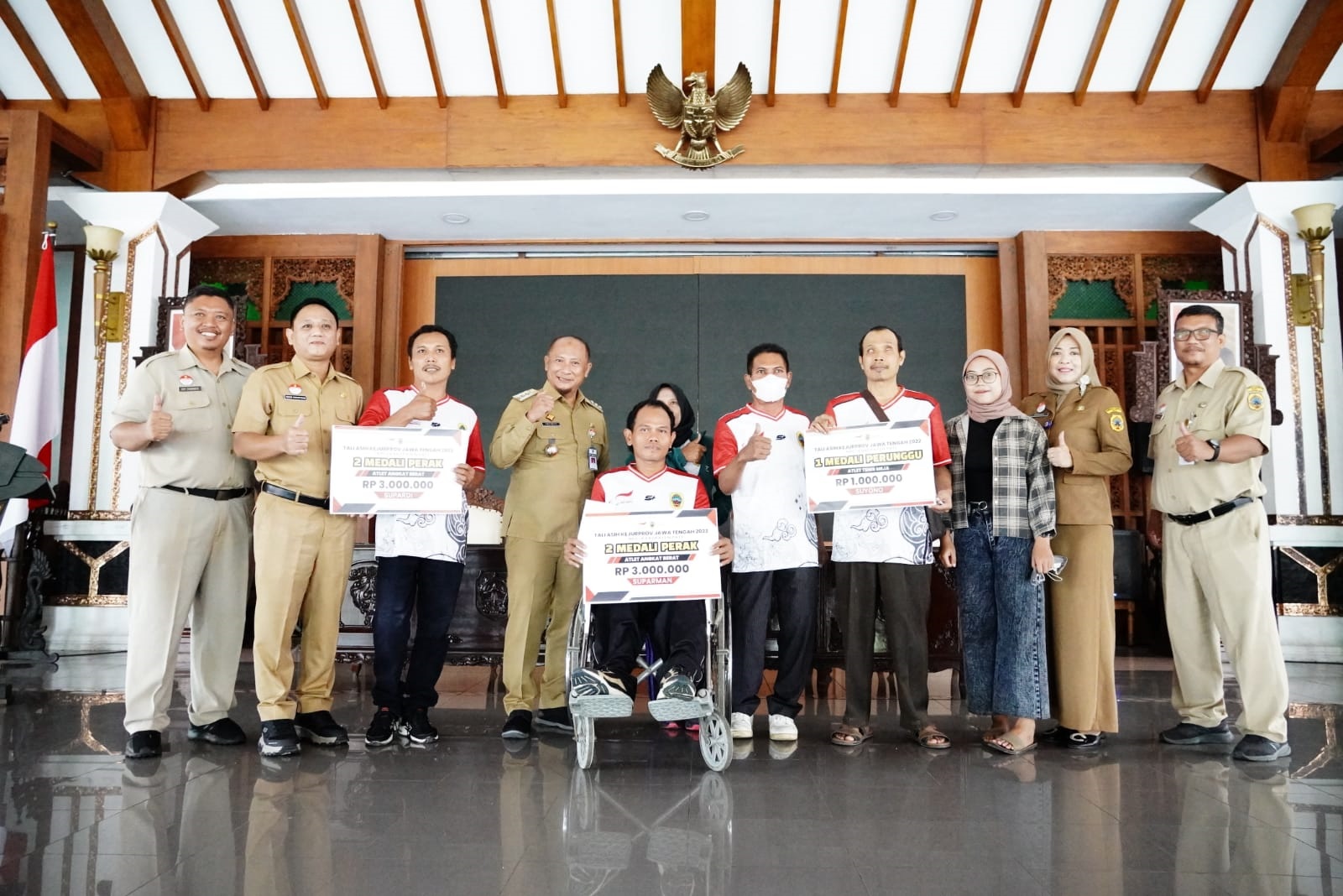 RILISJATENG.COM– Bertempat di Pendapa Kabupaten Pati, Penjabat Bupati Pati Henggar Budi Anggoro, Senin (3/4), menyerahkan tali asih kepada atlet National Paralympic Committe Indonesia (NPCI) Pati, yang telah berlaga di Kejurprov Jawa Tengah Tahun 2022.